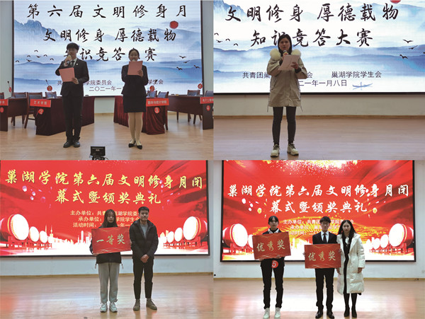 为弘扬中华优秀传统文化,树立克己修身的道德风范和崇德重礼的价值取向,营造良好的校园氛围,2020年12月25日至2021年1月8日,校团委、校学生会面向全校学生开展第六届大学生“文明修身月”主题教育活动。以其特有的文化魅力和新颖的比赛形式吸引广大学子踊跃参加,对弘扬和传承中华传统文化起到了较好效果。