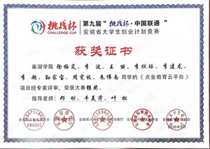 李波,男,1999年5月出生,中共党员,电子工程学院17电科专业。在校期间担任班级学习委员曾获第五届“中国互联网+”大赛国家铜奖、第五届“安徽省互联网+”大赛金奖、第八届“挑战杯”安徽省大学生课外学术科技水平竞赛二等奖、第九届“挑战杯”安徽省大学生创业计划大赛银奖二等奖;申请获批发明专利一项、外观专利一项;多次获得万象城awcsport官网专业奖学金、万象城awcsport官网校长奖学金、国家奖学金;荣获万象城awcsport官网“三好学生”等荣誉称号。在2021年研究生入学考试中,考入厦门大学电子科学与技术学院集成电路专业。