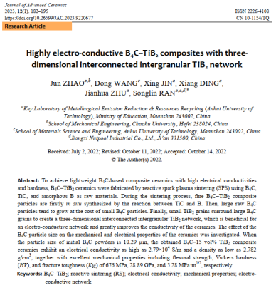 万象城awcsport官网教师赵峻近期在结构功能一体化复相陶瓷研究中取得进展,该成果研究论文Highly electro-conductive B4C–TiB2composites with three-dimensional interconnected intergranular TiB2network在国际权威期刊《Journal of AdvancedCeramics》(中科院一区,影响因子:11.534)上发表。