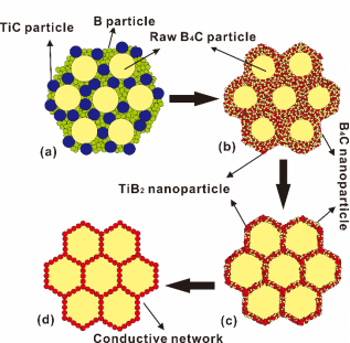 B4C陶瓷具有熔点高、密度低、化学稳定性强、耐磨性好等优良性能,广泛应用于对耐磨性要求高的领域,如装甲防护。在B4C基体中引入第二相TiB2形成B4C‒TiB2复相陶瓷,不仅能有效提高B4C陶瓷的力学性能,还能显著降低复相陶瓷的电阻率,实现结构功能一体化。然而,TiB2相对于B4C比重大、本征硬度低,因此,TiB2的加入增加了复相陶瓷的比重,降低了材料的硬度。研究发现,降低B4C‒TiB2复相陶瓷中TiB2一定的比例,在保证高致密度和良好导电性的前提下,可制备出超轻、超硬的B4C‒TiB2复相陶瓷材料。通过研究复相陶瓷的微结构与其导电性能、力学性能间的关系,采用化学反应协同基体晶粒选择性吸收生长法可制备一种低TiB2含量的超轻、超硬、导电性能好的B4C‒TiB2复相陶瓷并实现对B4C‒TiB2复相陶瓷的结构和功能可控调节。该研究方法为结构功能一体化材料的制备及性能研究提供了一种新的思路。