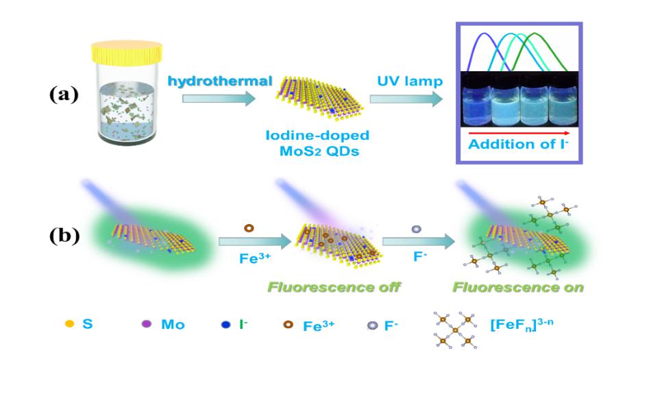 氟是维系人体正常活动的必需元素之一。然而,一旦人体中的F-离子含量超,就会诱发氟斑牙、骨畸形、肾结石、甚至癌症等疾病。如何快速、简便和精确地检测水源中的F-离子含量,对维护人类生命健康具有重要意义。水环境研究中心吴凤义老师及团队,通过水热法合成了3-5nm MoS2QDs。并以此为荧光基体材料开发了 “turn-off-on”型荧光探针用于巢湖水体中的F-离子检测。研究发现,该荧光探针具有较强的荧光稳定性和较低生物毒性。在有其他阴阳离子和有机小分子存在情况下,荧光探针对F-离子显示很高的选择性,对水体中的F-离子检测最低检出限达1.4μM。