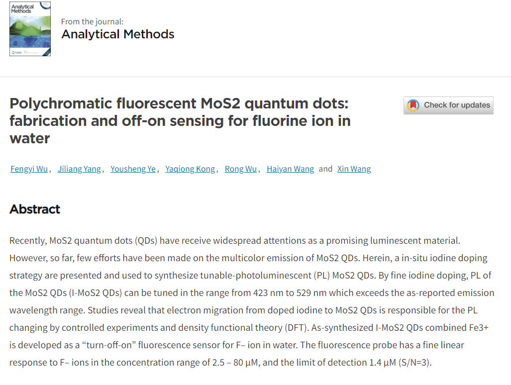 量子点(quantum dots,QDs)是指激子在三维空间上都被限域的半导体纳米结构材料。量子点在显示、光伏电池能源、分析检测有着广泛地应用。最近,万象城awcsport官网水环境研究中心吴凤义老师及团队开发一种新型、环保MoS2QDs并用于巢湖水体中F-离子检测。相关成果以“Polychromatic fluorescent MoS2quantum dots: fabrication and off-on sensing for fluorine ion in water”为题发表在国际权威期刊《AnalyticalMethods》(SIC收录,IF:3.532)。
