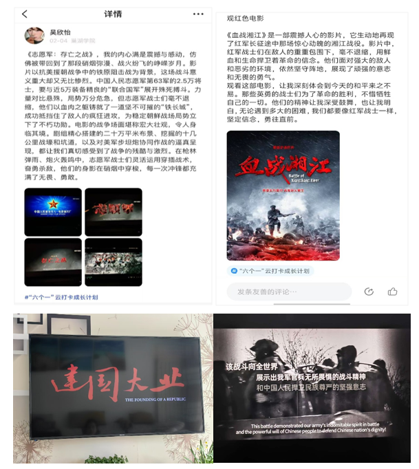 观影润心,汲取精神力量。同学们在假期中,通过观看红色电影,不仅表达对先辈们爱国爱家的崇高敬意,也通过观影过程和分享观影心得,在光影中追忆红色历史,在传承中弘扬伟大精神。