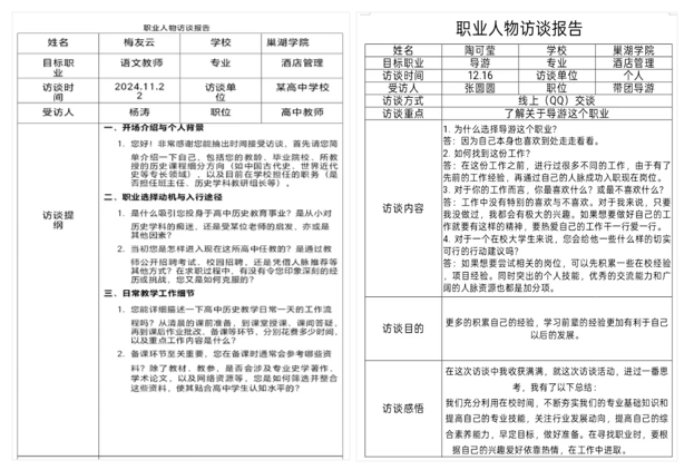 深耕调研,洞察行业趋势。寒假期间,同学们积极实践访谈生涯人物活动,围绕感兴趣的职业领域,调动身边的朋辈资源,展开面对面访谈,深入了解行业现状、发展趋势及人才需求,从而拓宽职业视野,助力未来发展。