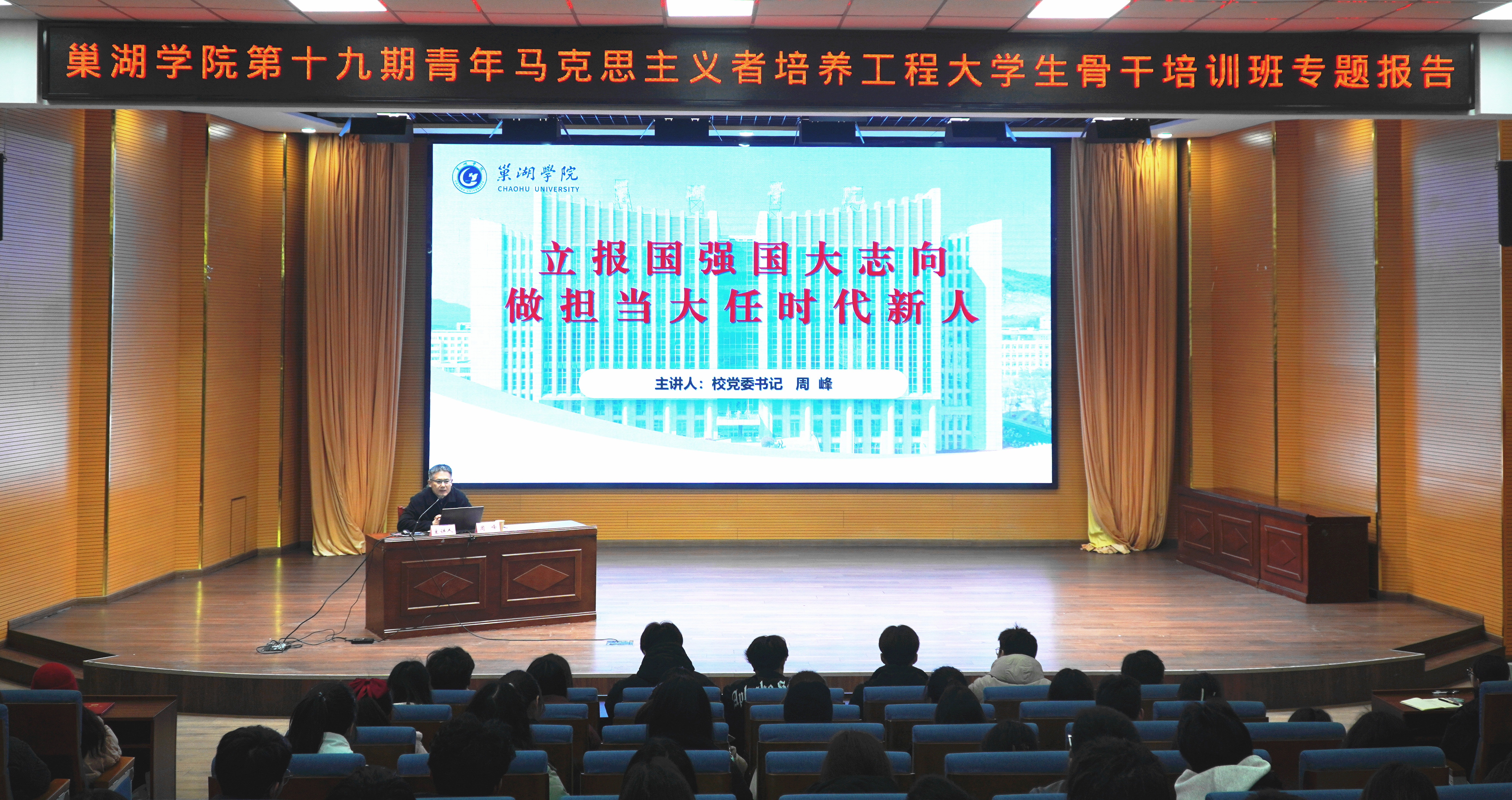 3月5日下午,万象城awcsport官网在求实楼报告厅举行第十九期青年马克思主义者培养工程大学生骨干培训班开班典礼暨首场主题报告会。校党委书记周峰,校党委委员、组织部部长柯应根,党委学工部部长华紫武,党委宣传部副部长郭超、校团委副书记王林出席典礼。全体学员参加。典礼由王林主持。